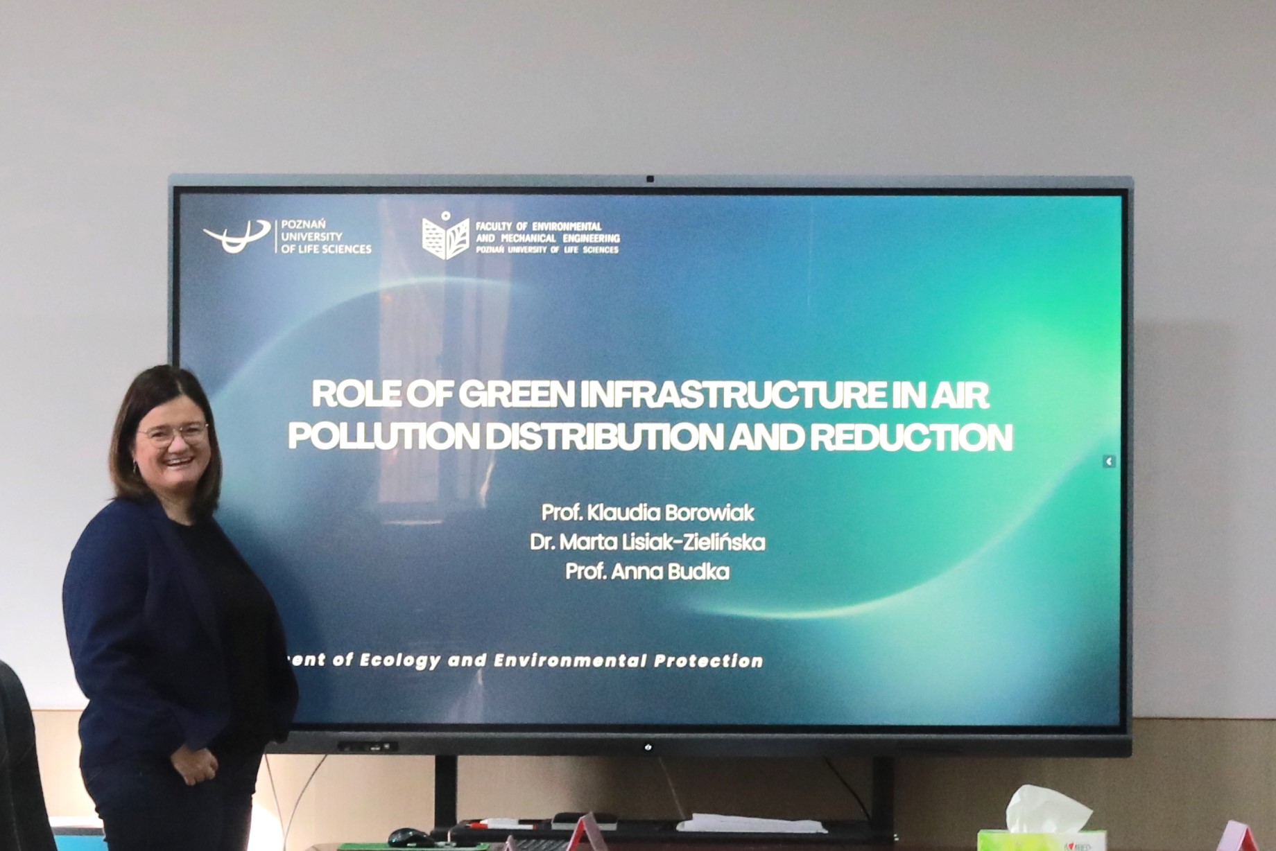 克劳迪娅教授系统阐释了绿色基础设施在缓解与调节空气污染方面的关键作用,并结合波兰本土实践案例,深入解析其在大气污染治理中的具体应用路径。同时,她聚焦城市气候改善领域,运用科学分析方法,从植物对污染物的吸附净化机制,到不同植物群落配置对城市微气候的调节效应,全方位解读植物群落的生态效益。交流环节,师生围绕绿色基础设施的本土化应用、植物群落优化策略等方面积极提问,克劳迪娅教授逐一细致解答,现场学术互动氛围浓厚。